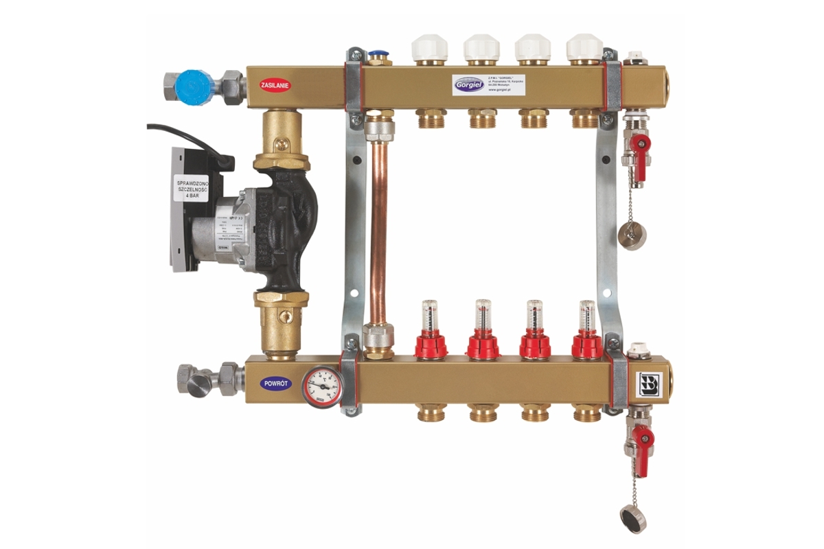 сталевий брус з внутрішніми різьбами 1/2 “та 1”, редукційний ніпель 1/2 “х 3/4”, латунна заглушка 1 “з сальніком, витратомір, вставка термостатичного клапана різьбою M30 x 1,5, ручний розповітрювач 1 / 2 “, кріплення з оцинкованої сталі, енергозберігаючий насос Wilo, кульові запірні крани; байпасна система, термометр, вентиль подачі (1/2 “або 3/4” відповідно), зворотний клапан (1/2 “або 3/4” відповідно), кульові зливні крани 1/2 “